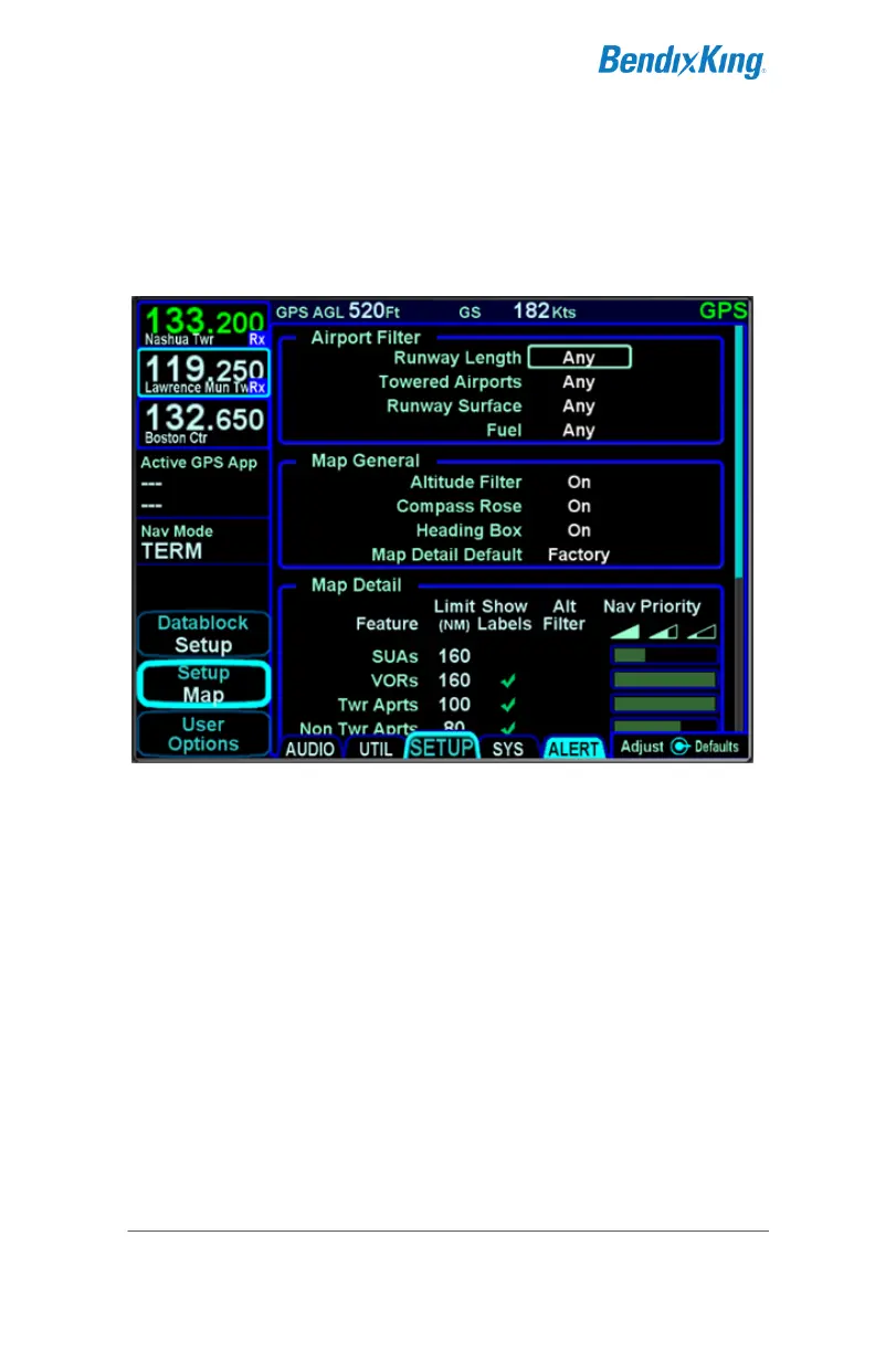 (VFR, IFR, Factory, Custom). Restoring factory defaults is