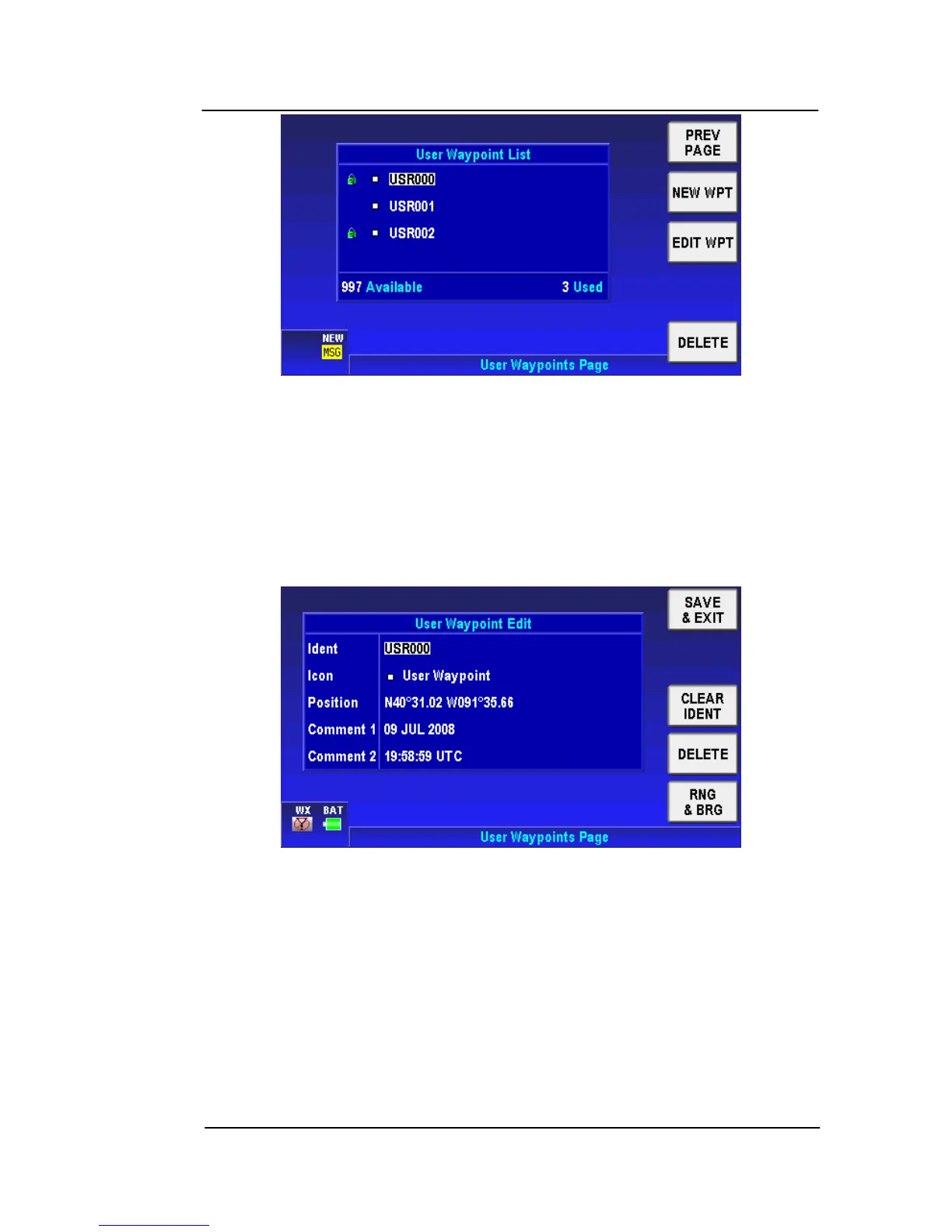 The user can tap the NEW WPT soft key to define a new WPT. A