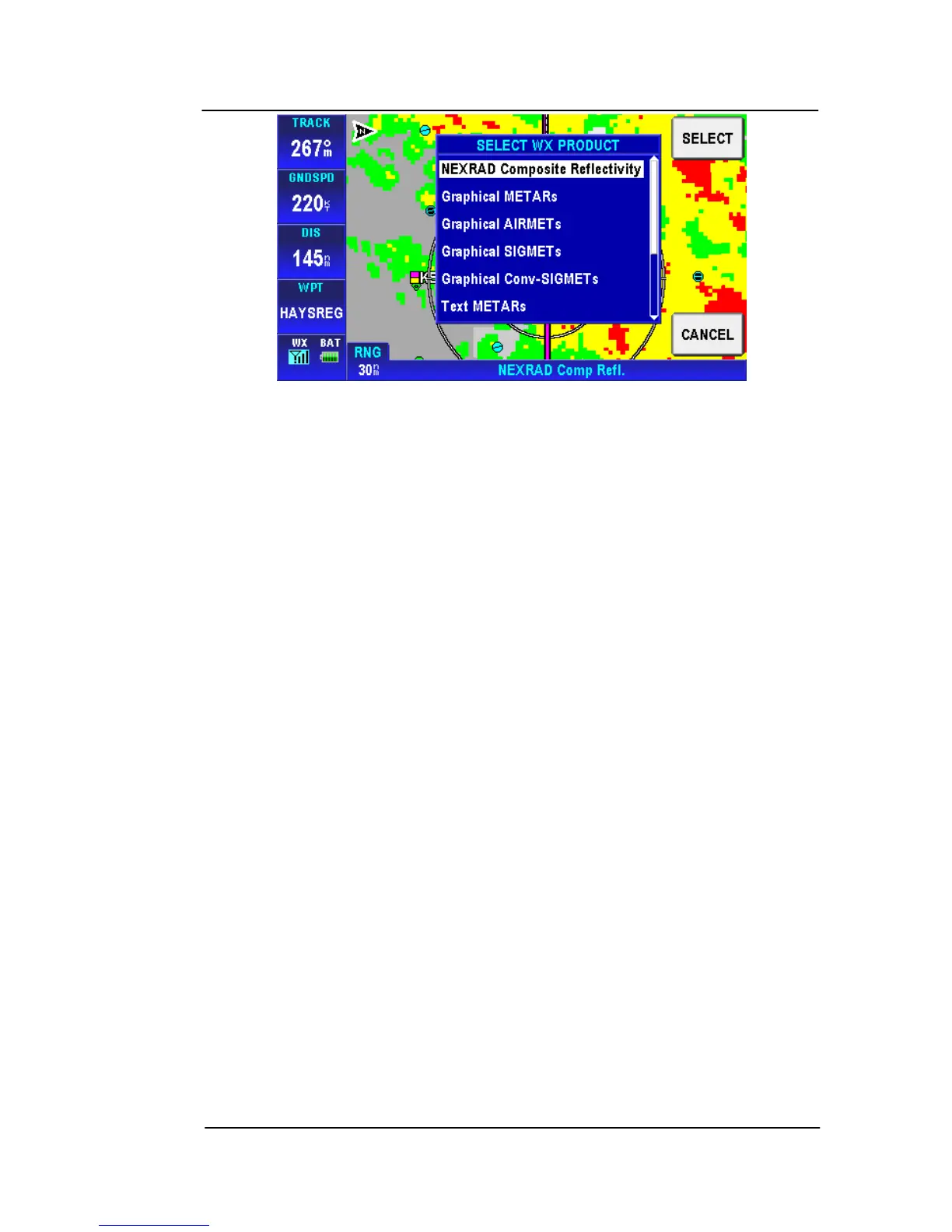 The following selections are available from the SELECT WX