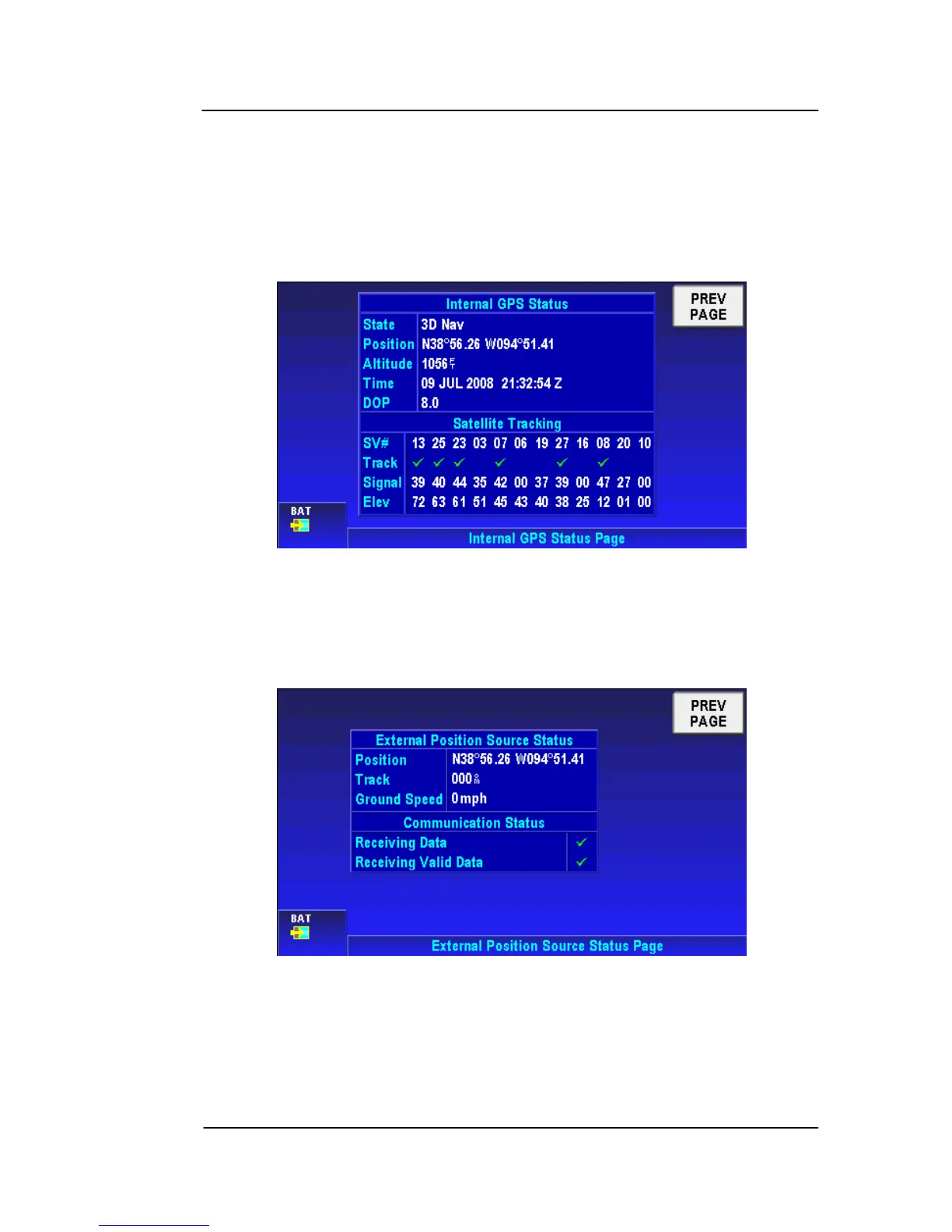 Internal GPS Status: The Internal GPS Status Page shows the