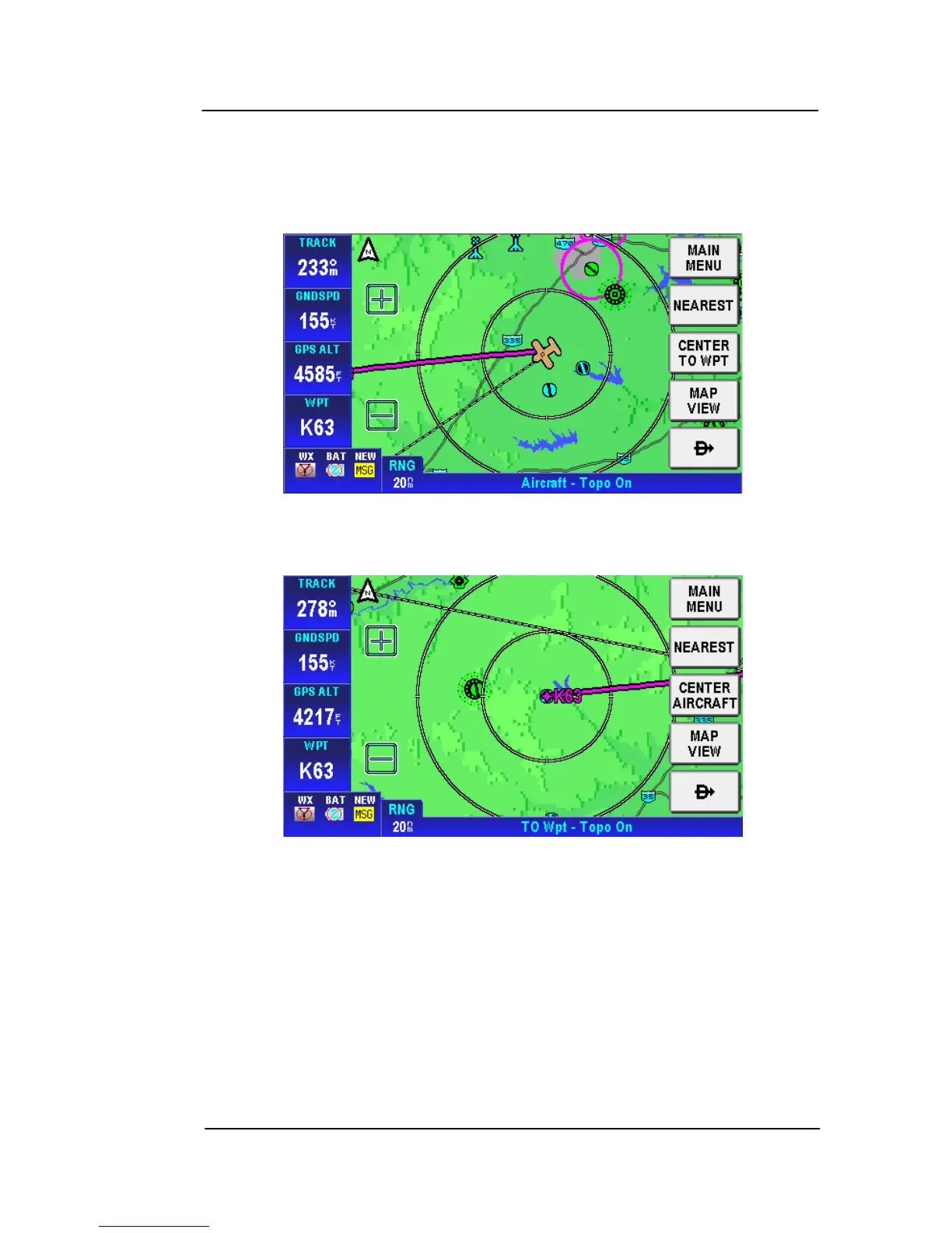 The CENTER TO WPT soft key changes to a CENTER AIRCRAFT