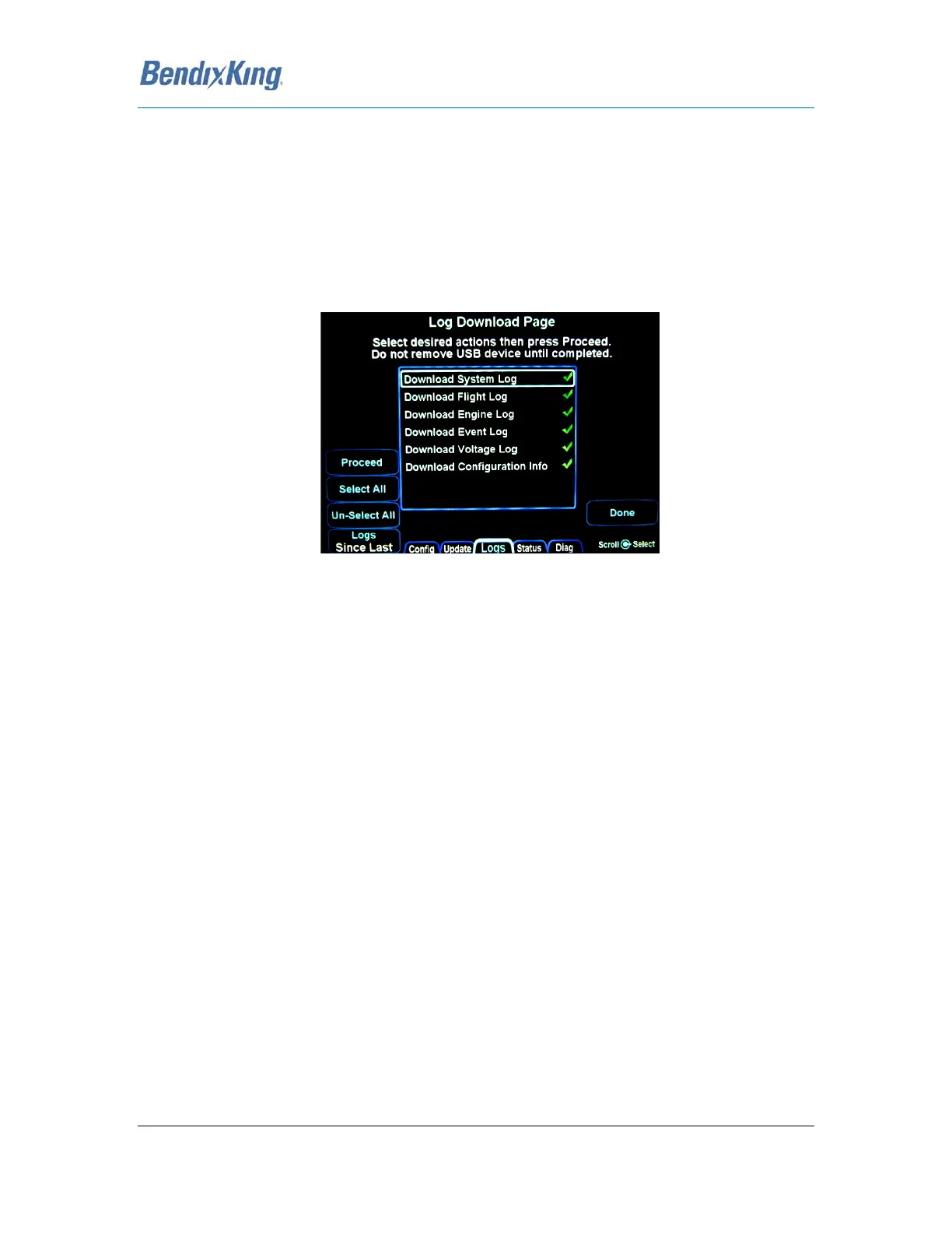 Pressing the “Proceed” LSK will immediately start downloading all logs listed in the center of the page