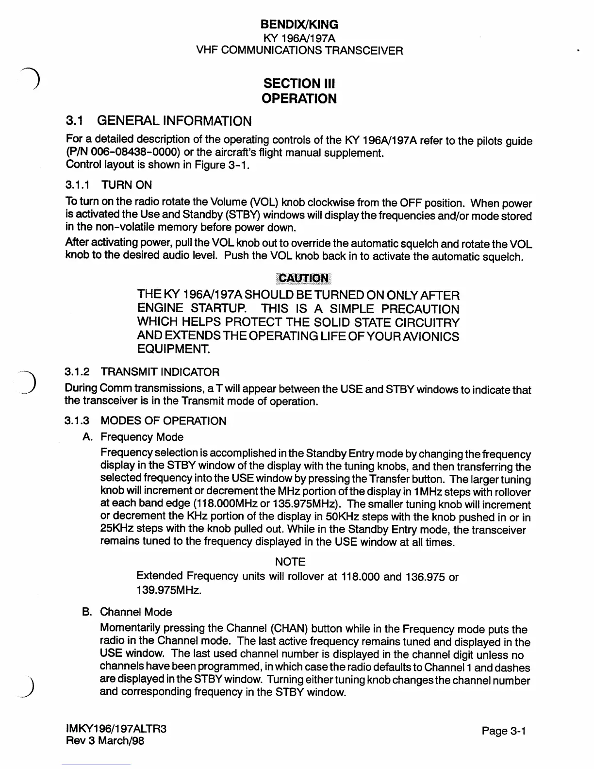 BENDIXKing KY 196A - Section III: Operation; General Information; Turn On; Modes of Operation