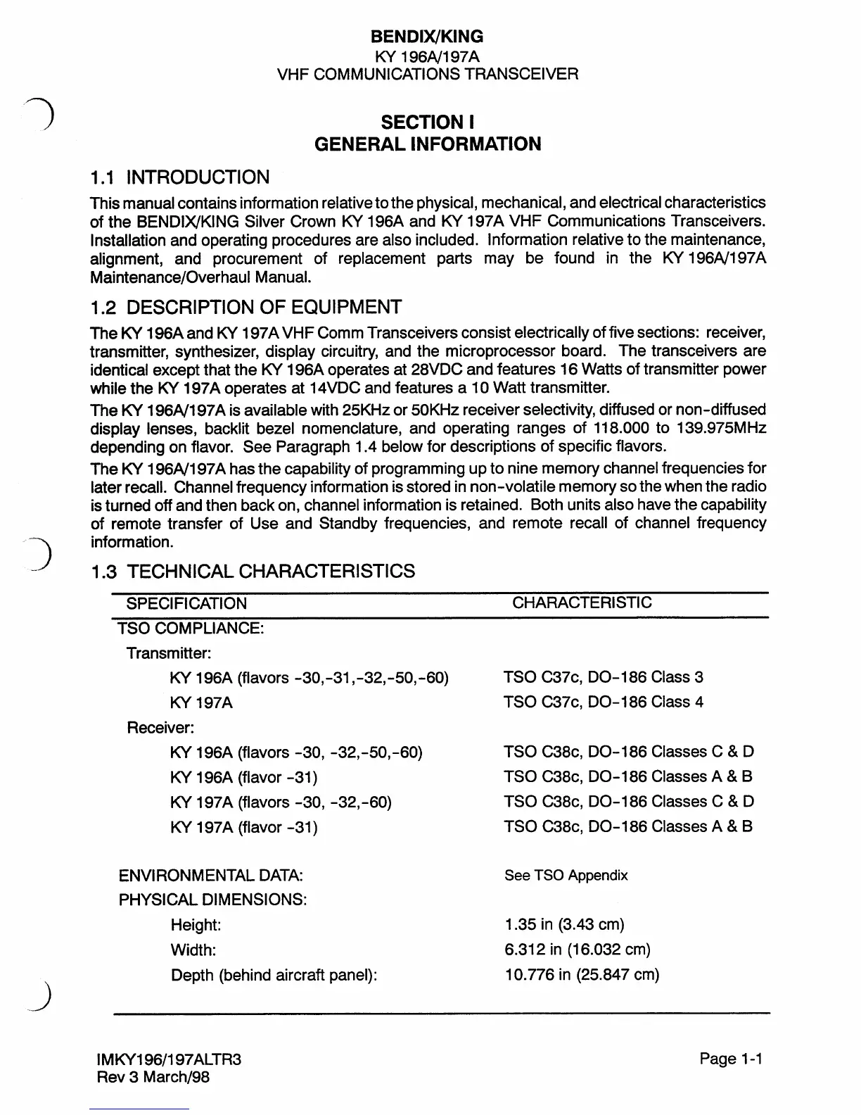 BENDIXKing KY 196A - Introduction; Description of Equipment; Technical Characteristics