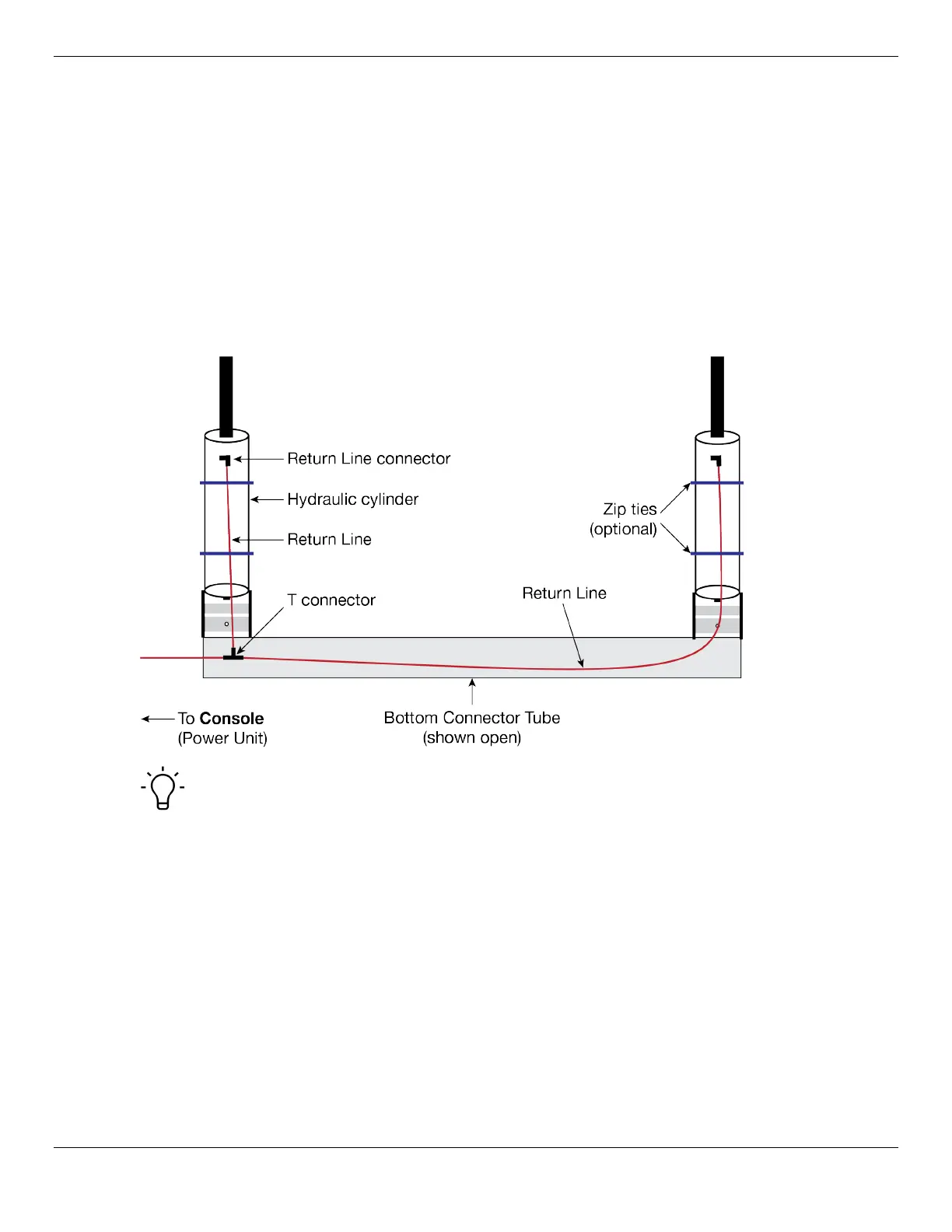 • From the T connector to the Return Line connector on the Hydraulic Cylinder nearest the Console