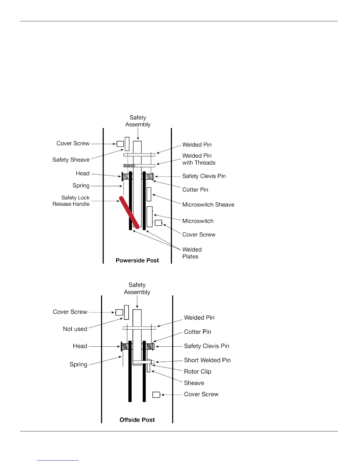 Each GP-7 lift has two Safety Assemblies: one on the Powerside Post (above the Power Unit) and the