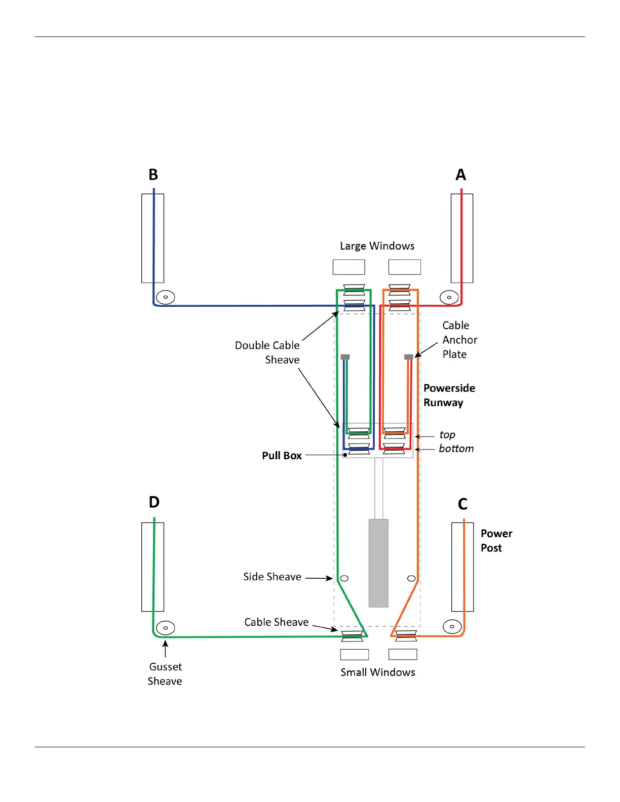 Cable Sheaves separated from Windows for clarity. Crosstubes not shown. Not to scale.
