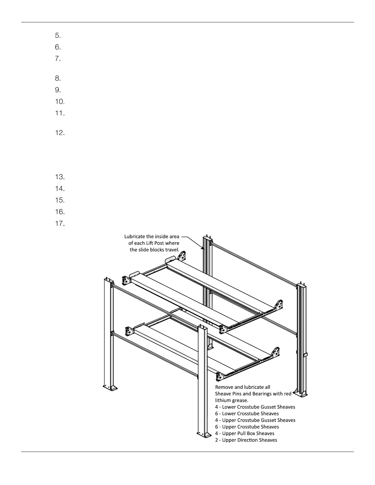 After lubricating all Sheaves and Pins on the Lower Platform apply power to the Lift and raise it off