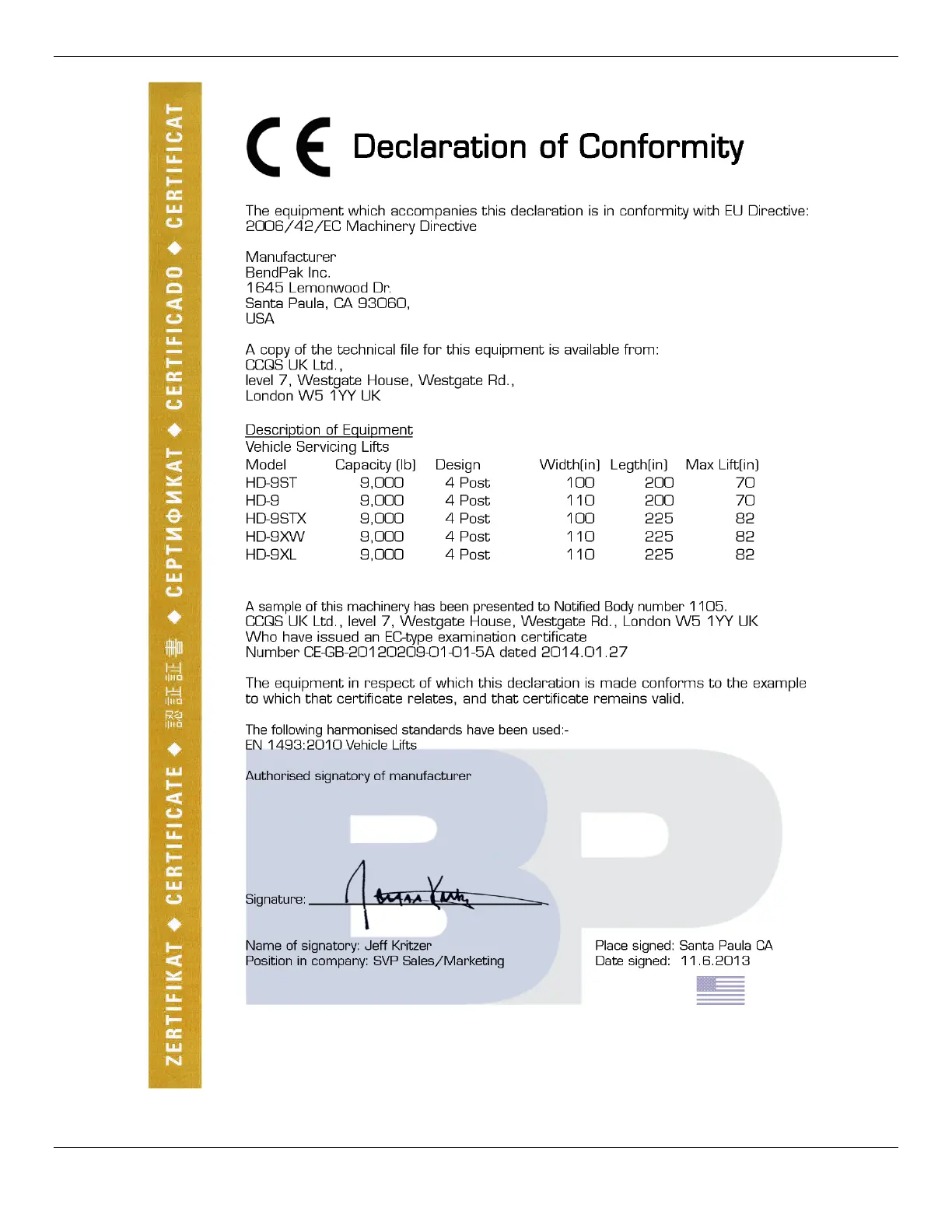 Other manuals for BendPak HD-9XW