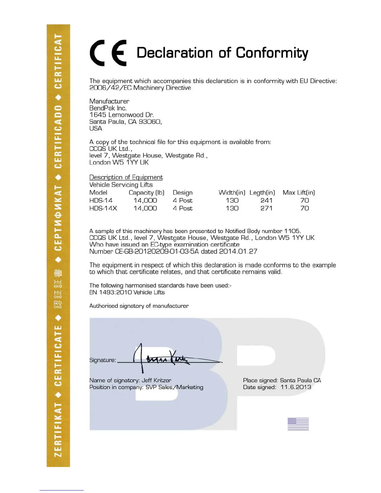 BendPak HDS-14X - Certificate of Compliance