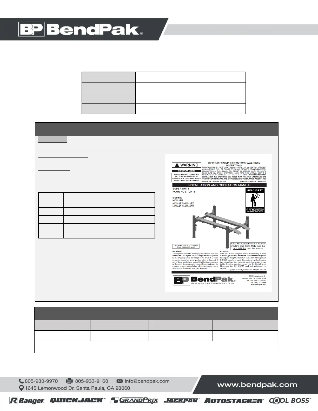 OR BENDPAK ENGINEERING APPROVED EQUIVALENT