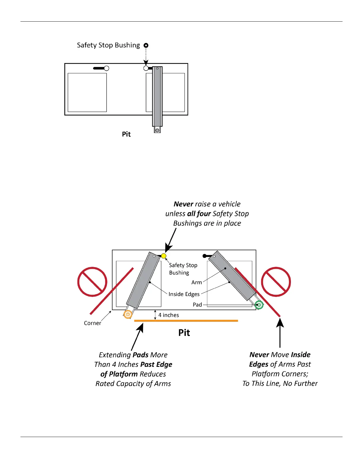 ⚠ WARNING Never move the inside edges of the Lift Arms past the corners of the Platform. They