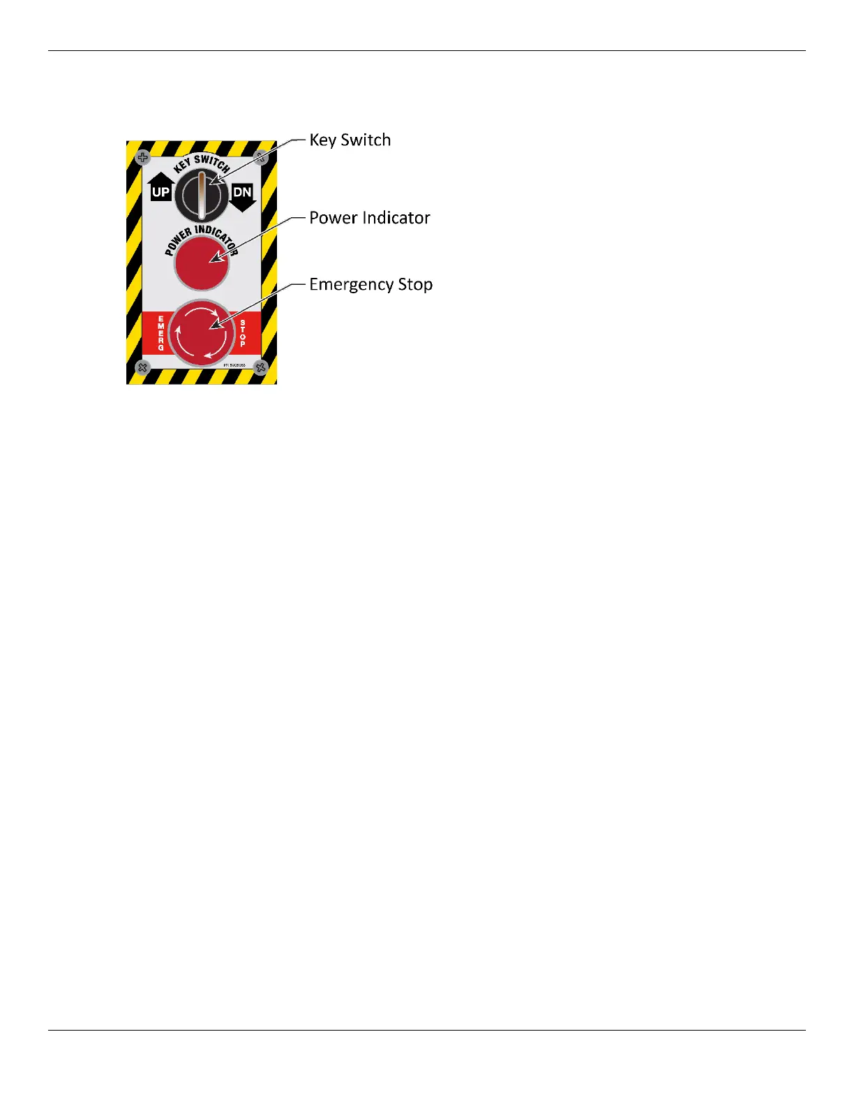 • The Emergency Stop Button, when pressed, stops the Lift immediately by removing power to