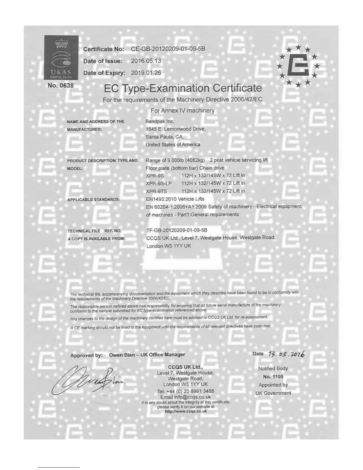 BendPak XPR-9TS - EC Type-Examination Certificate