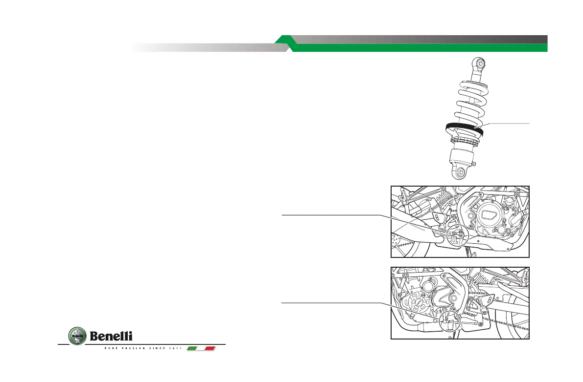 The rear shock absorber is equipped with adjustment ring nuts for preload adjustment.