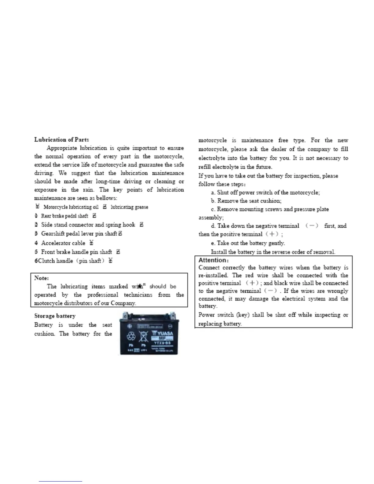 Benelli BN600 - Lubrication of Parts; Storage of Battery