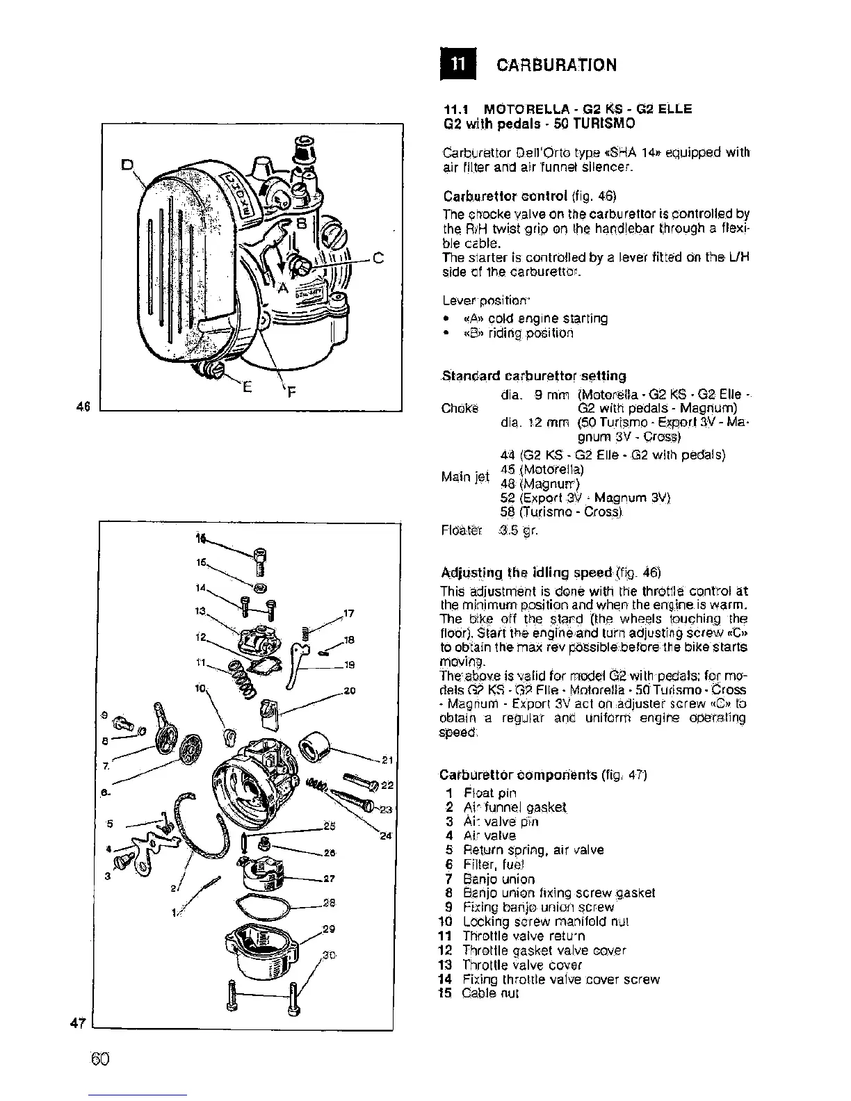 Benelli Export 3V "78" - CARBURATION; 11.1 MOTORELLA G2 KS G2 ELLE G2 with pedals 50 TURISMO; 11.2 125 TURISMO - 125 ENDURO