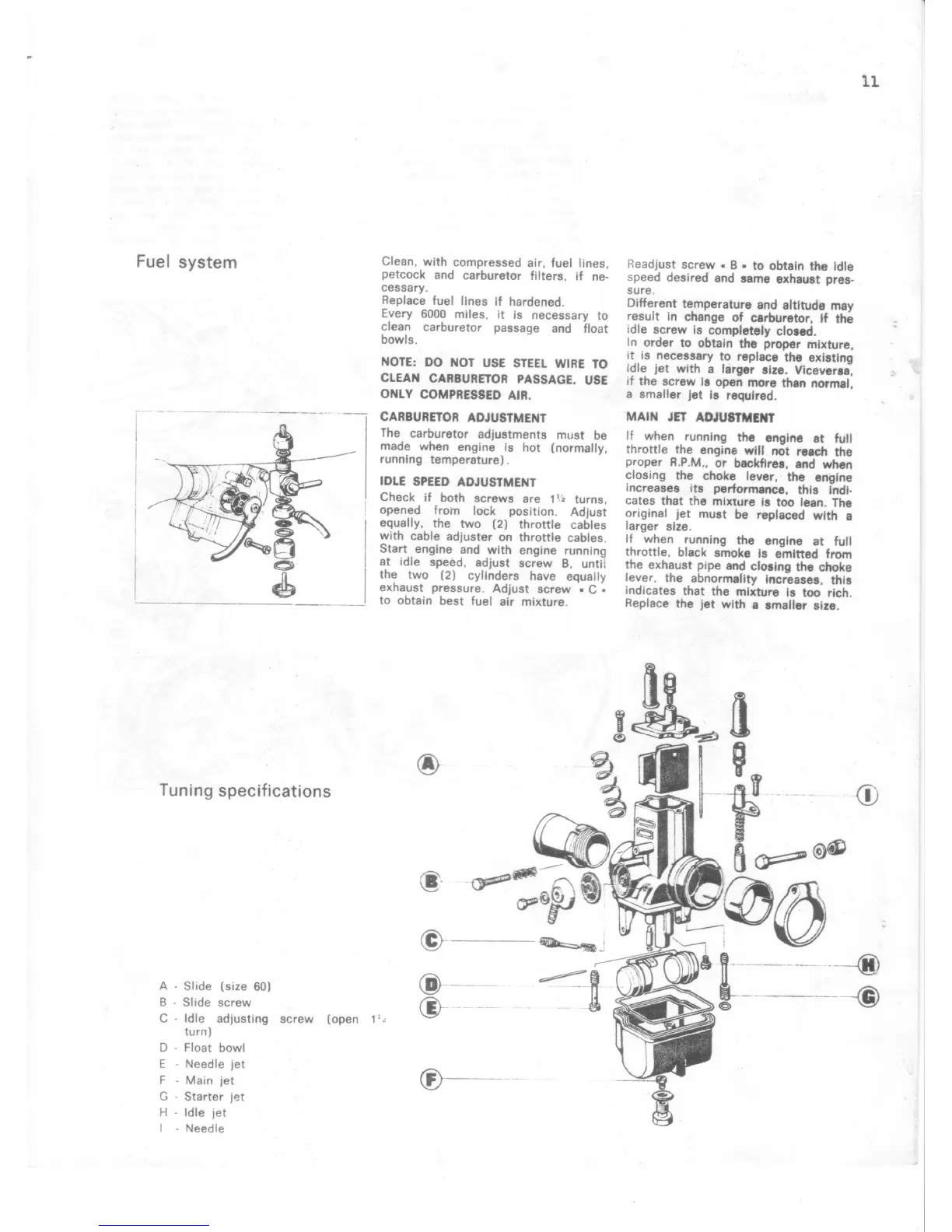 Benelli Tornado 650 - Fuel System; Tuning Specifications; Idle Speed Adjustment; Main Jet Adjustment