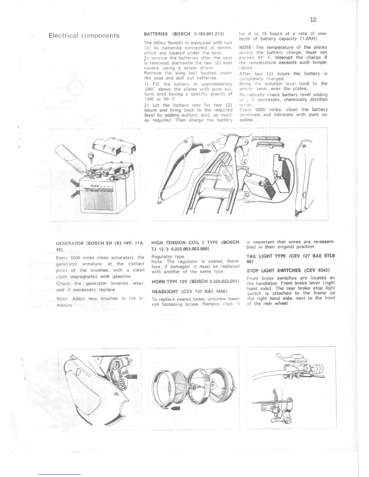 Benelli Tornado 650 - Electrical System Components; Battery Service and Charging; Generator and Coil; Lighting and Switches