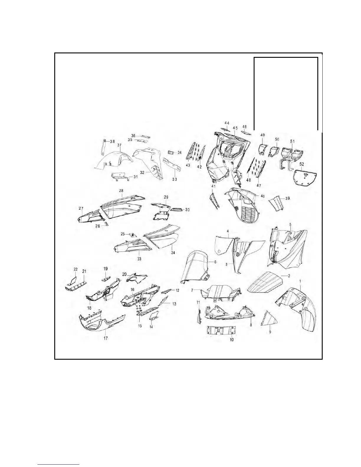 guard 46.) water filler 47.) left lattice of the foot guard 48.) protecting vent 49.) right inspection cover 50.) left