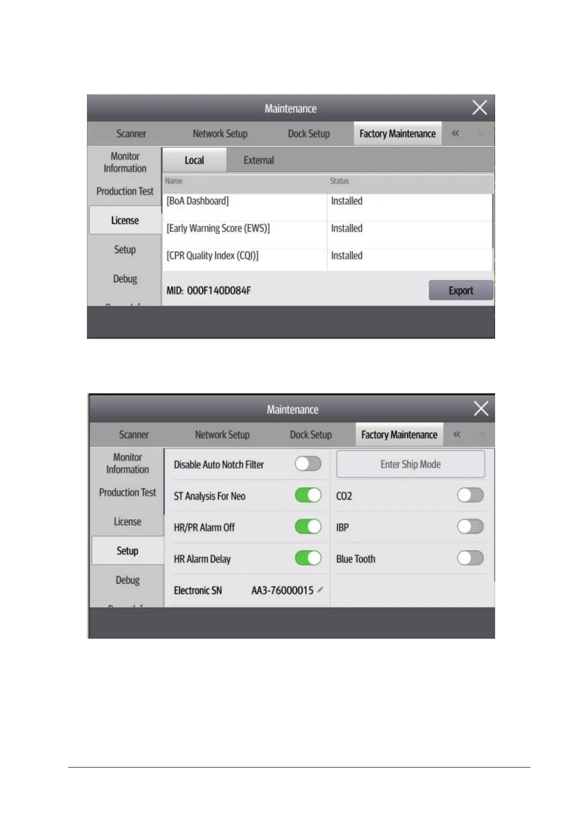 BeneVision N1 - 5.9.4 Software Licensing; 5.9.5 Settings; 5.9.6 Debugging; 5.9.7 Power Information