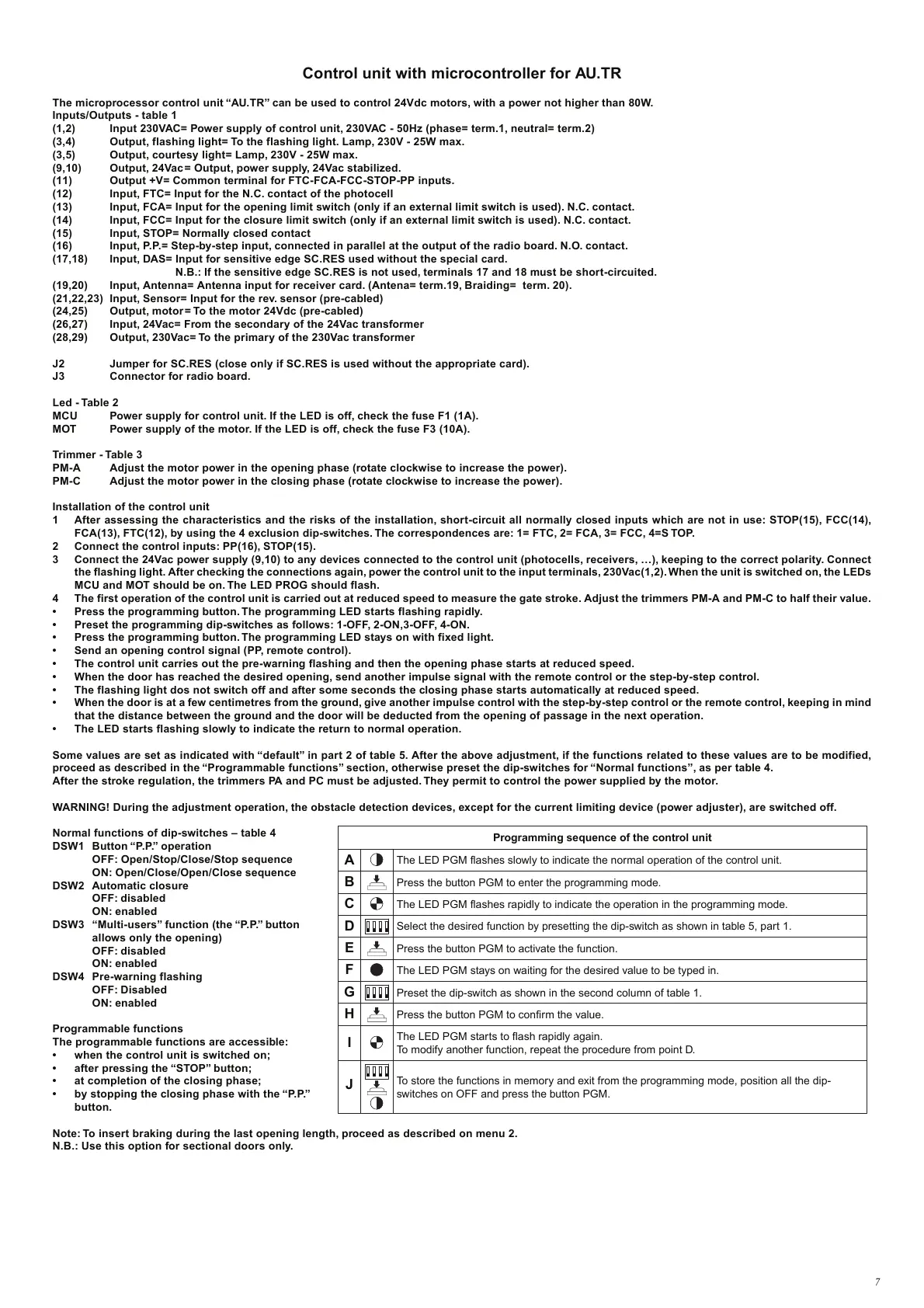 The microprocessor control unit “AU.TR” can be used to control 24Vdc motors, with a power not higher than 80W.
