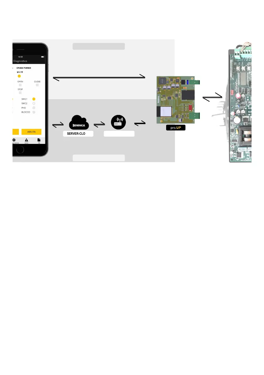 In this case, pro.UP connects using its WiFi module to a modem/router connected to the Benincà cloud server via an internet