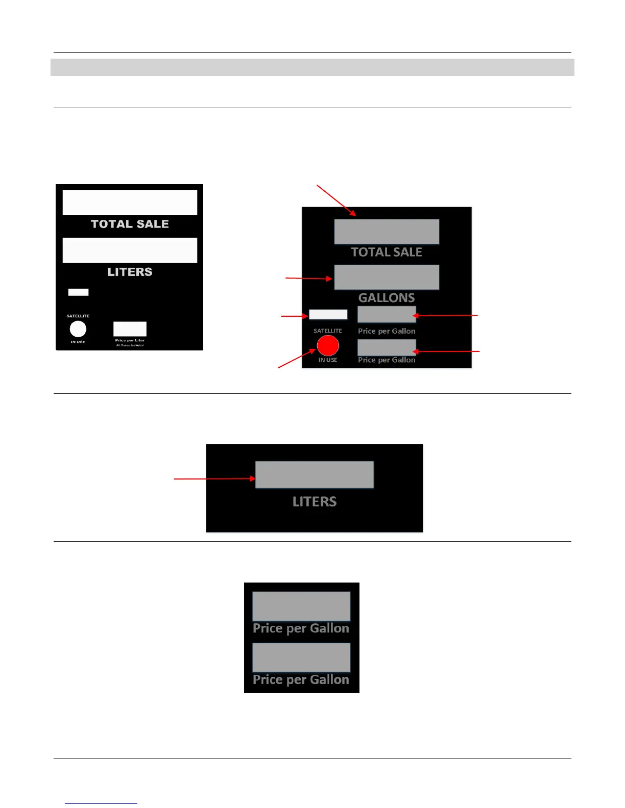 Displays Currency (Total Sale), Volume (Gallons or Liters), PPV (Price per Volume), Totalizer information, and houses the Satellite ‘In Use’