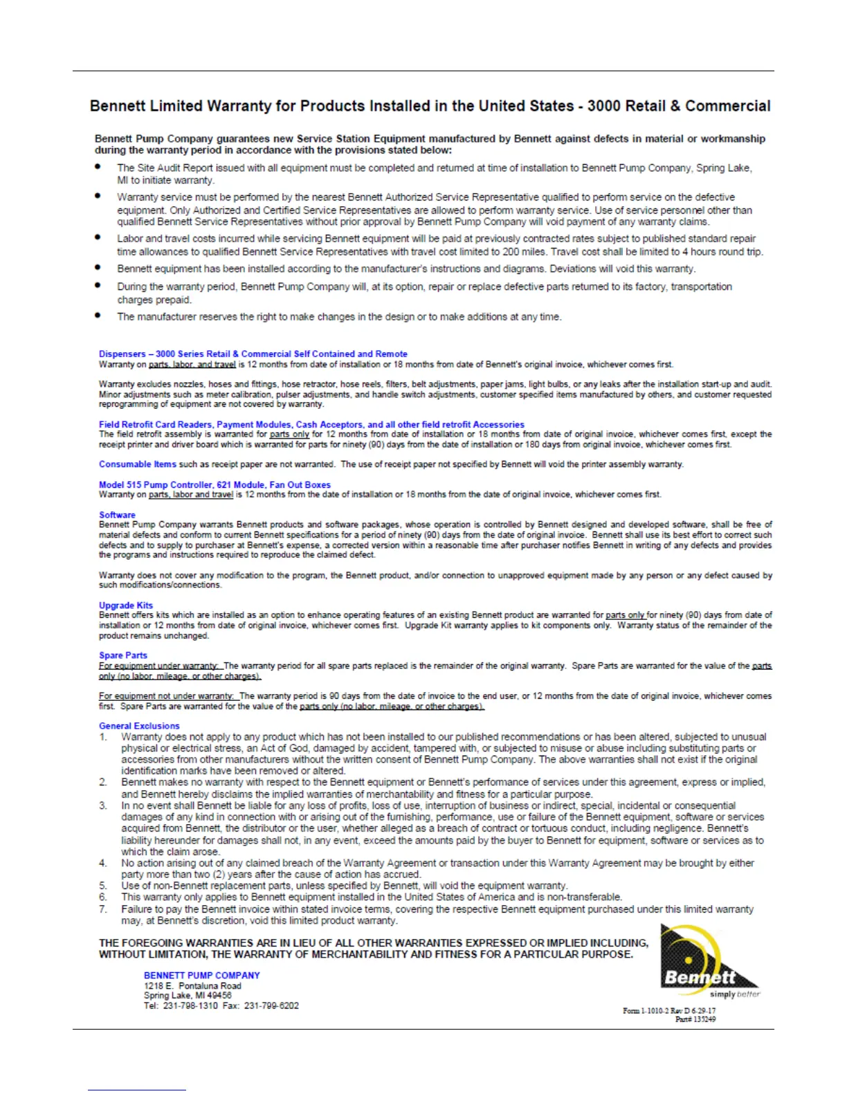 Bennett 3000 Series - Bennett Limited Warranty for 3000 Retail & Commercial Products; Warranty Exclusions and General Provisions