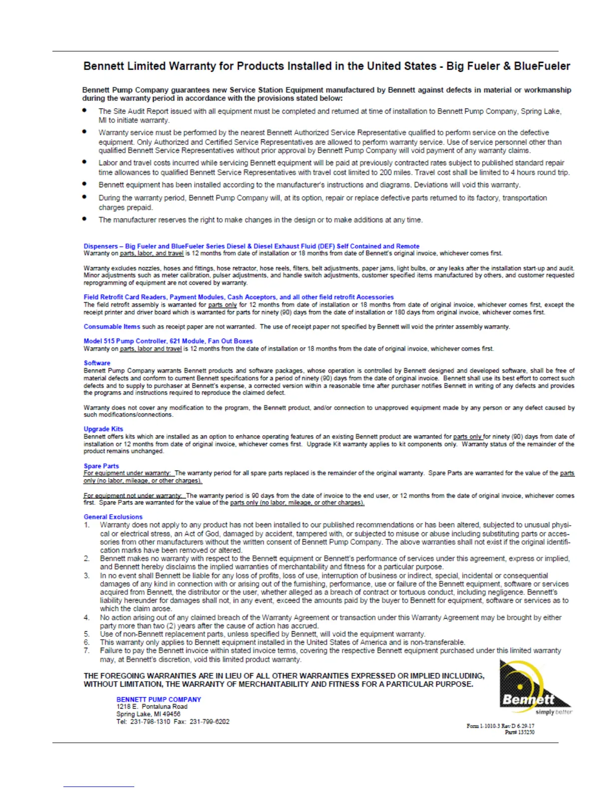 Bennett 3000 Series - Bennett Limited Warranty for Big Fueler & BlueFueler Products; Warranty Exclusions and General Provisions