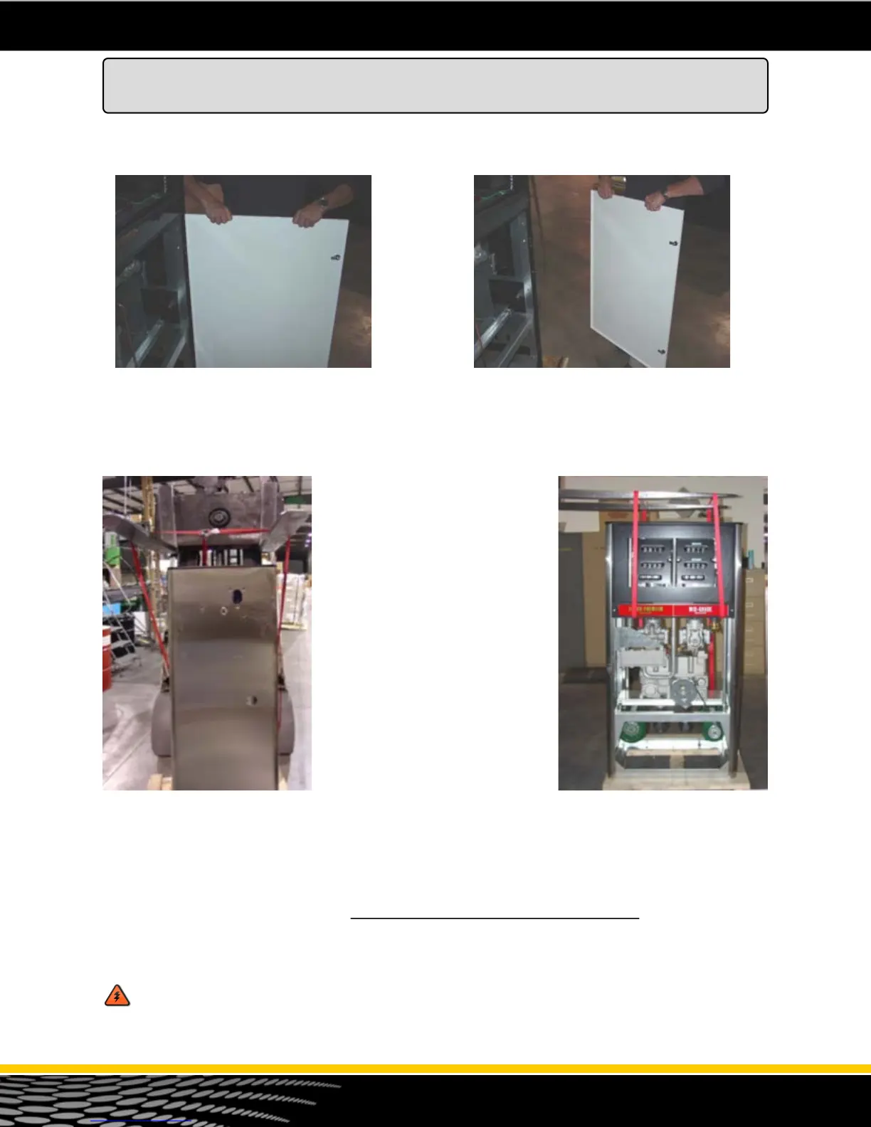 The dispenser is bolted to a pallet with bolts and nuts. With the lower doors removed and safely stored