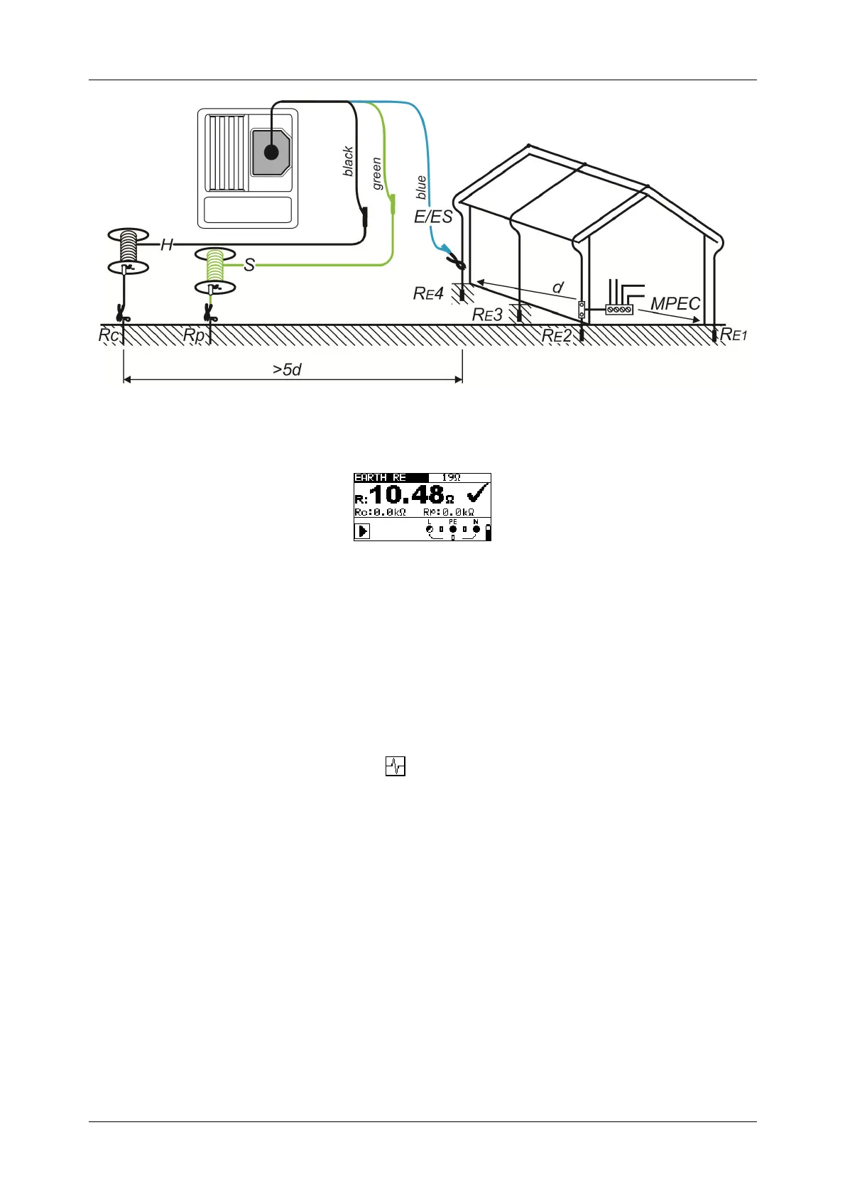 between the earth connection (E/ES) and the probe (H) should be at least five times