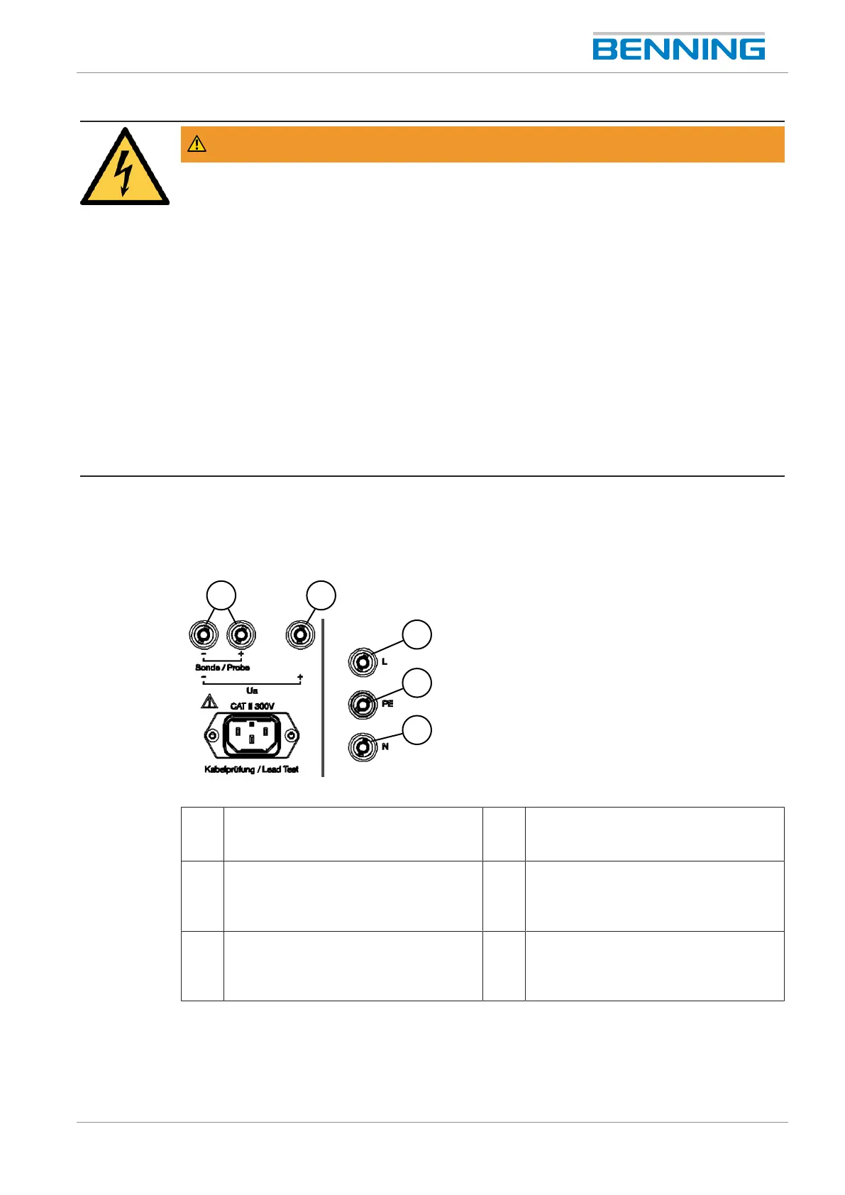 • Do not touch the bare measuring probe tips of the safety measuring lines or the bare