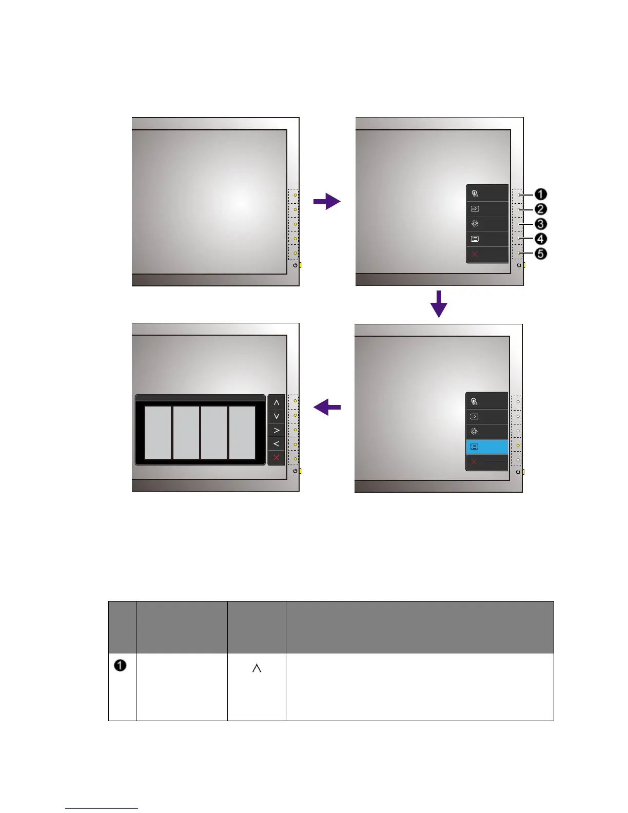 All OSD (On Screen Display) menus can be accessed by the control keys. You can use the OSD