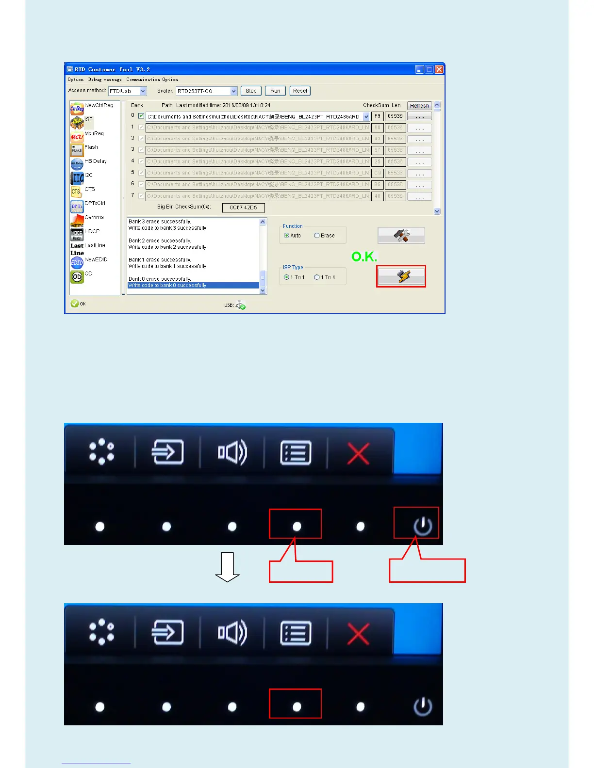 (2) Press “menu” key and “power on” key synchronously as below figure. When the screen lights, release the two