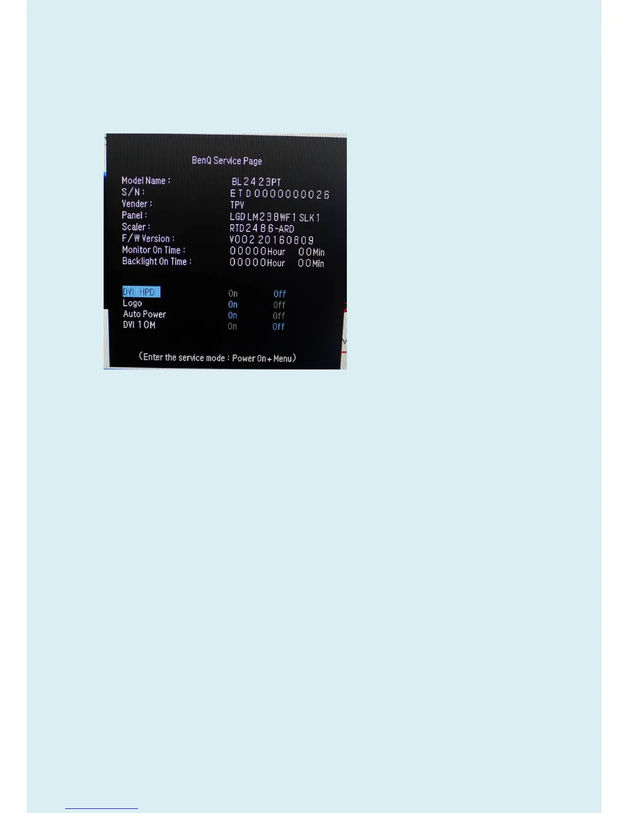 Model name, S/N, Vender, panel, scalar, F/W version, Monitor on time, Backlight on time.
