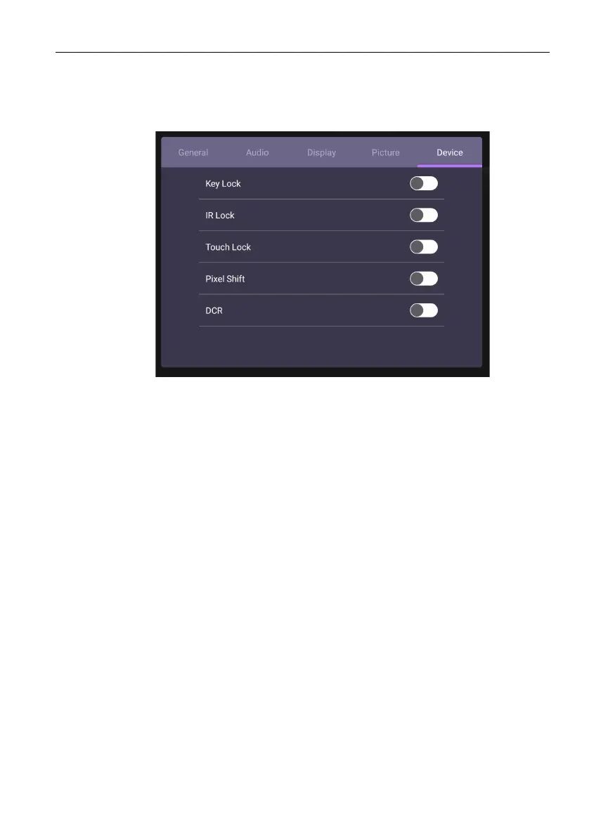 Key lock, IR lock, Touch lock, Pixel shift, and DCR.