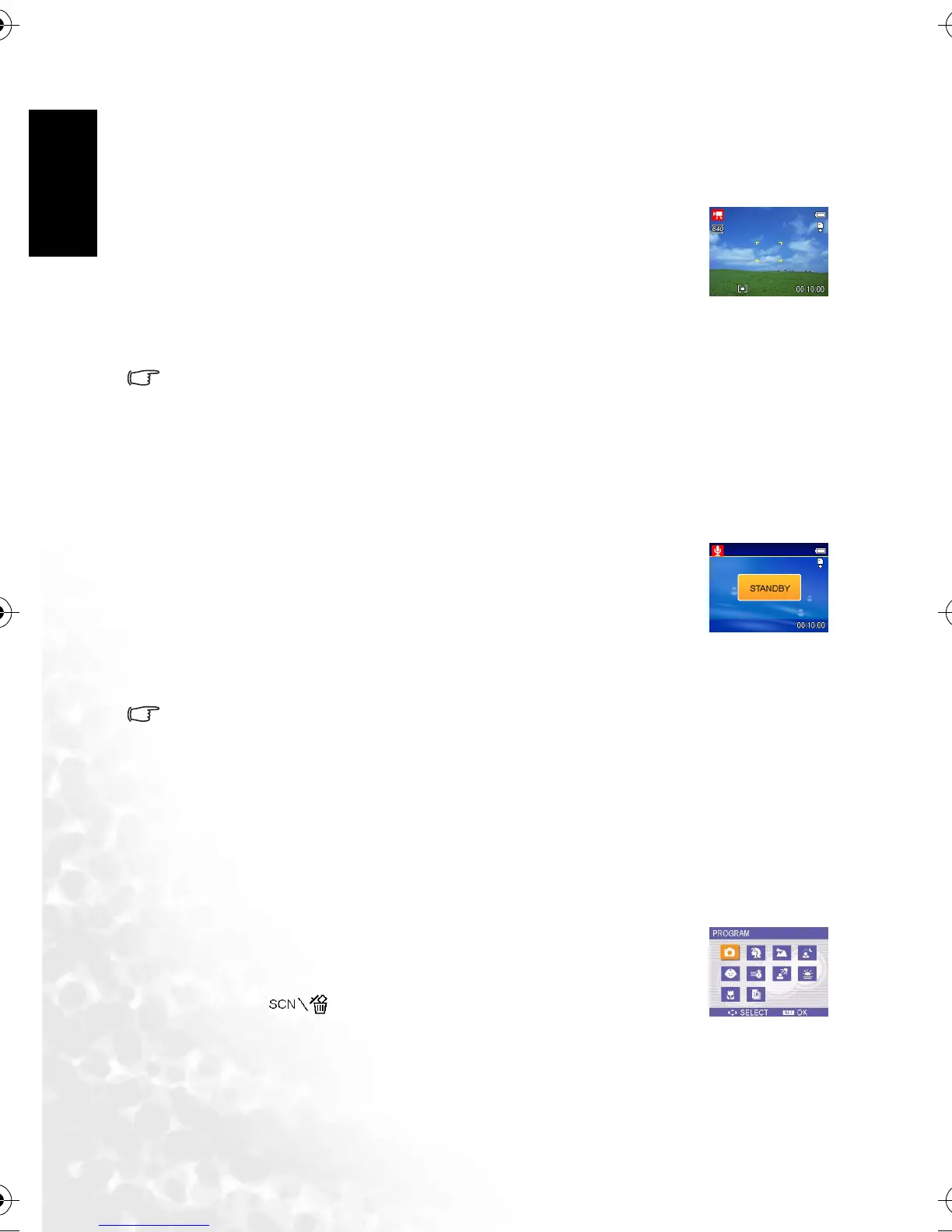 • The voices are recorded from the microphone of the camera. Be careful to avoid touch-