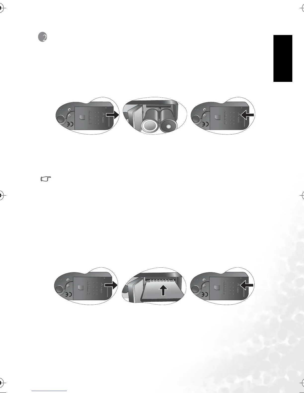 2. Insert two AA-size alkaline batteries with the positive(+) and negative(-) poles matching