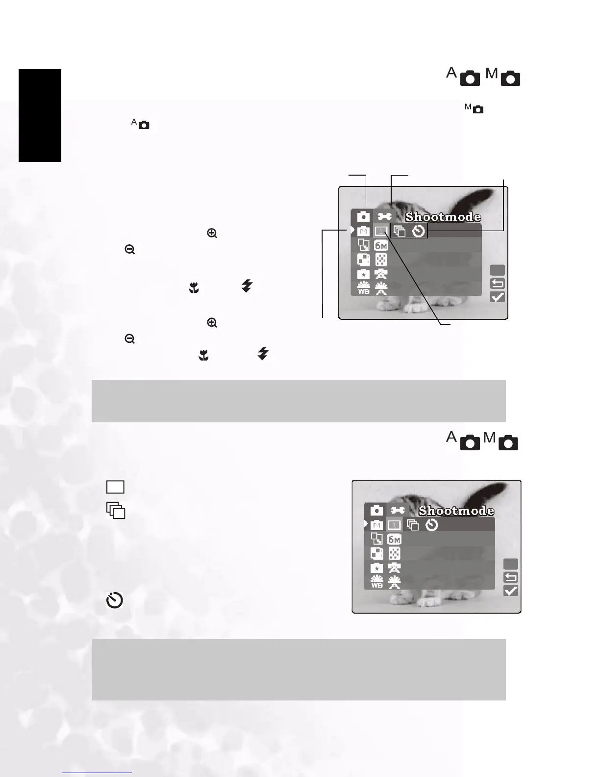 Press the macro and flash buttons to select and set the mode setting as before.
