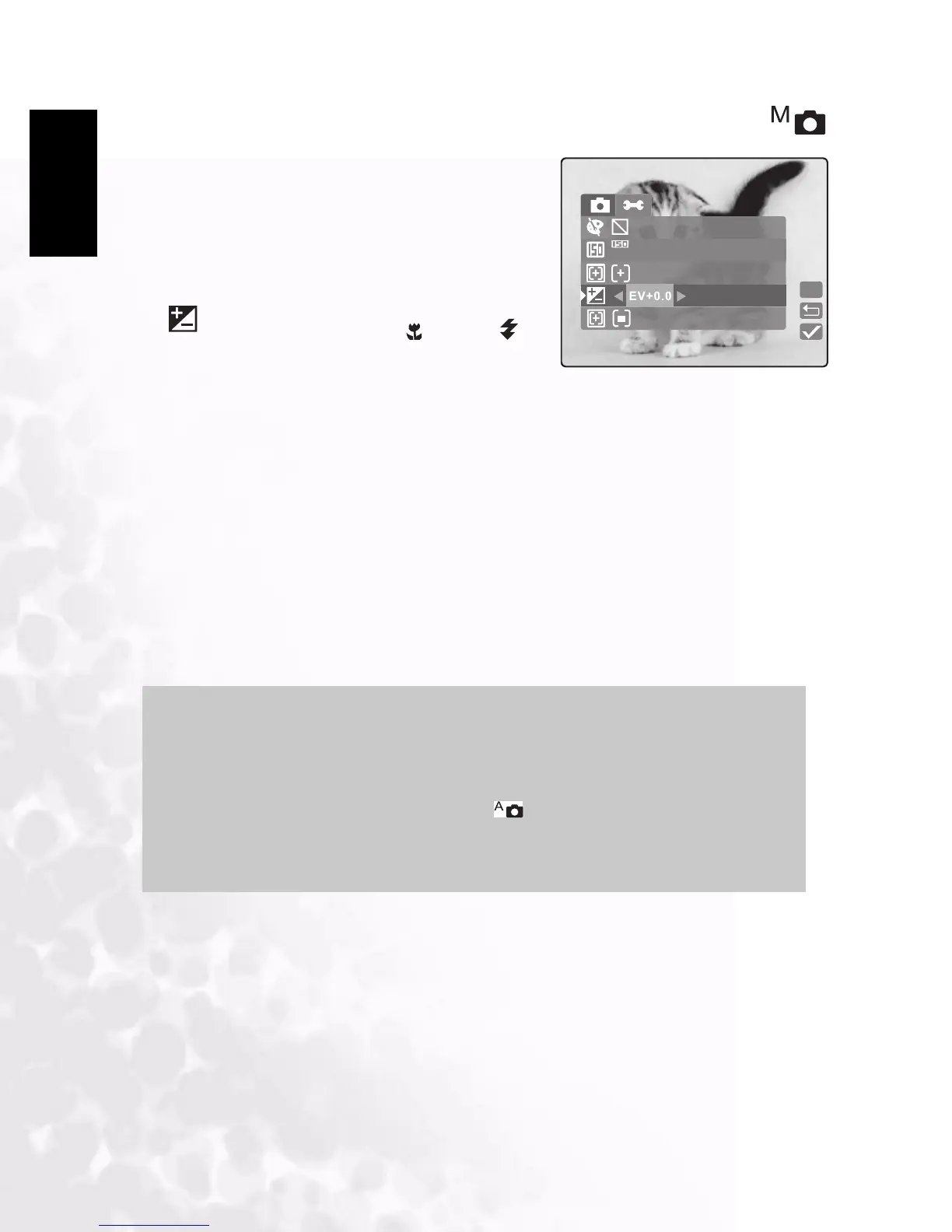 • In “Exposure compensation”, the default value is “0.0EV”. The setting range is as fol-