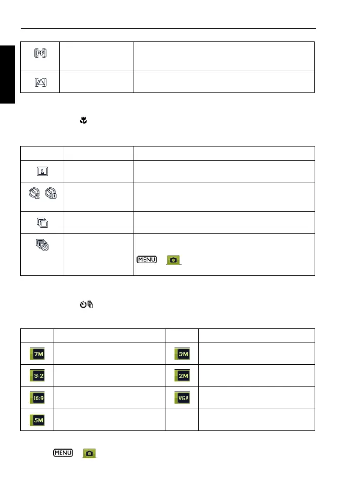 Self-timer Automatically takes a picture after 2 or 10 second delay.