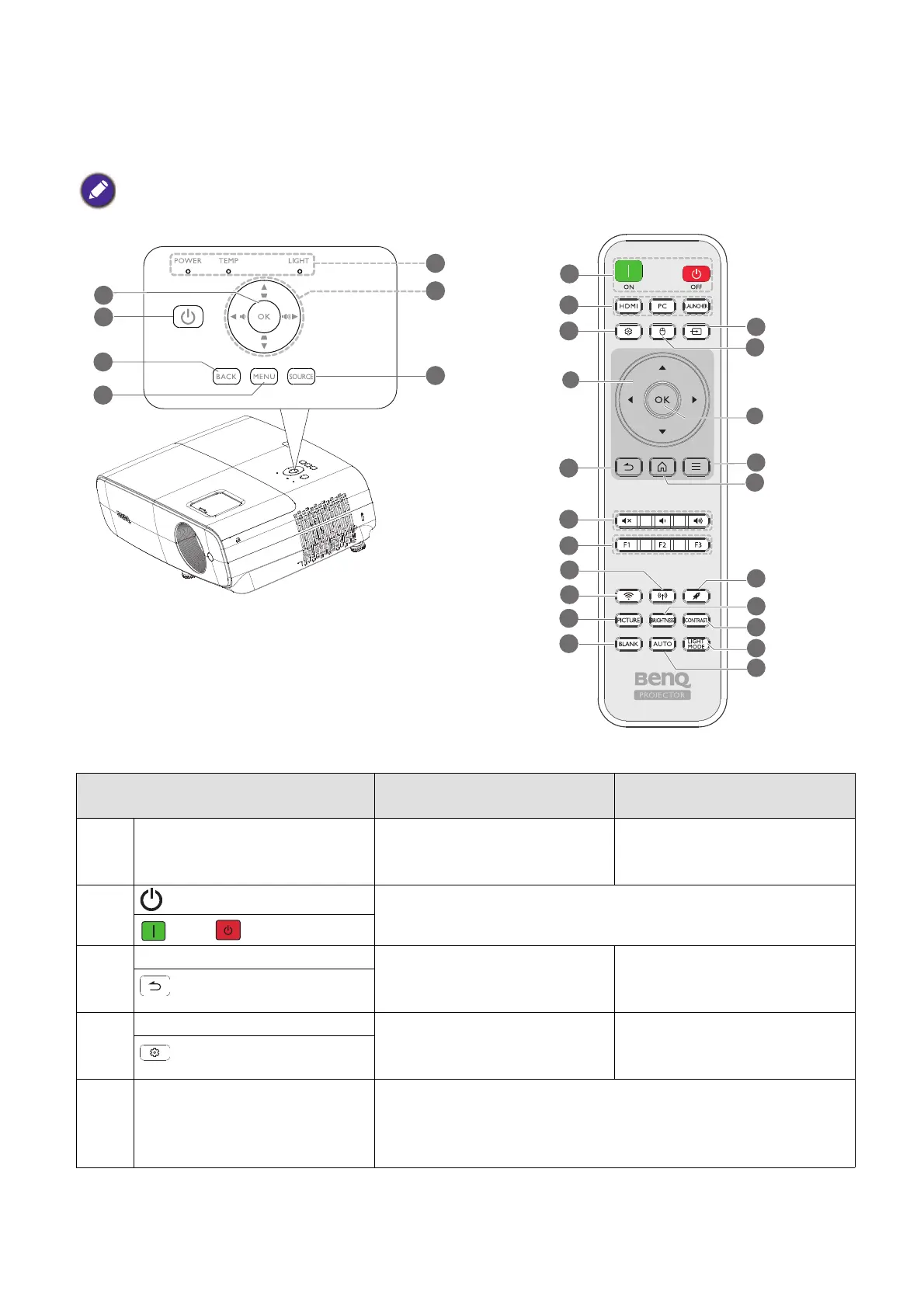 4. MENU Enters the Settings menu. Turns on or off the projector’s
