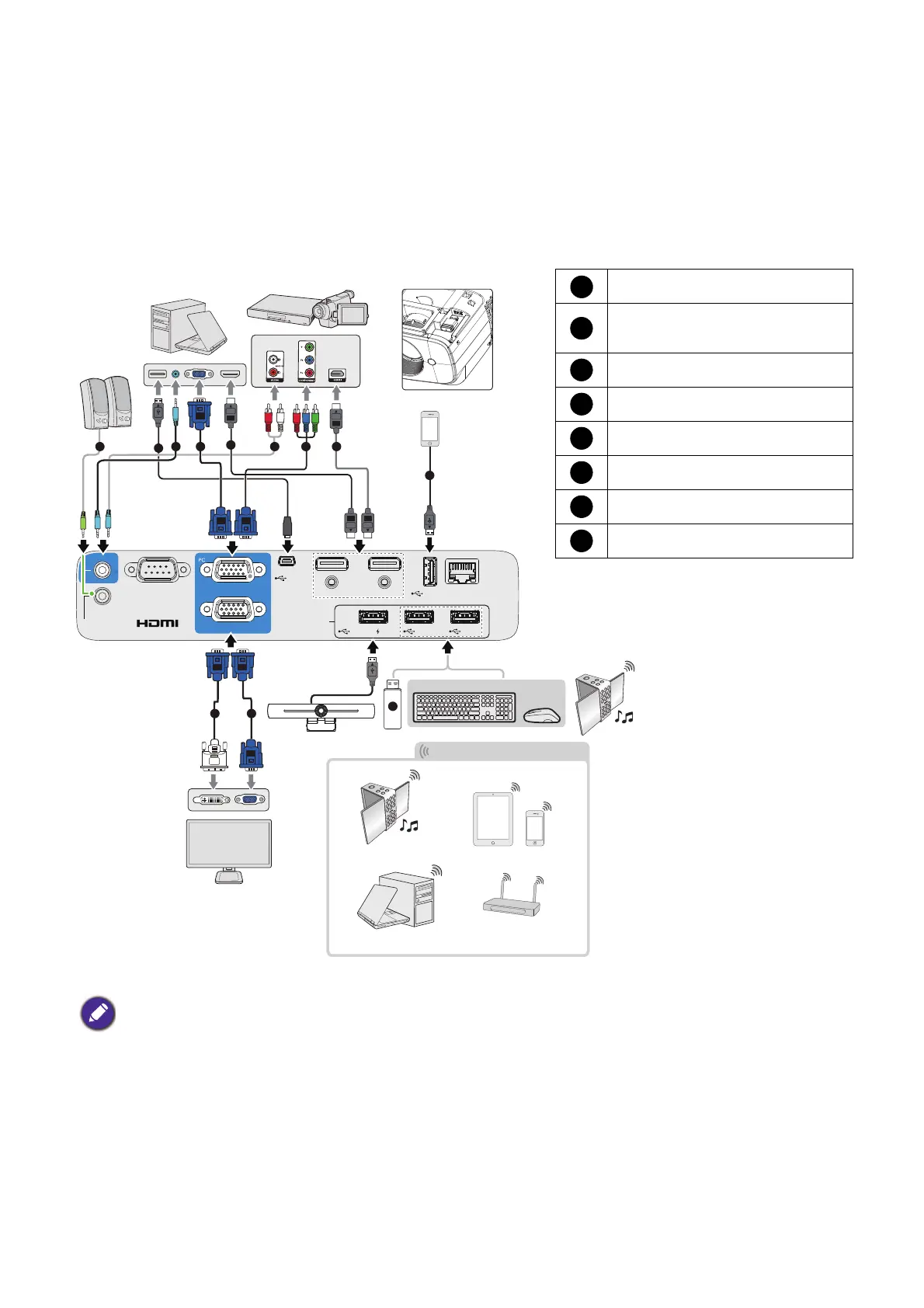 • In the connections above, some cables may not be included with the projector (see Shipping contents on page 7).
