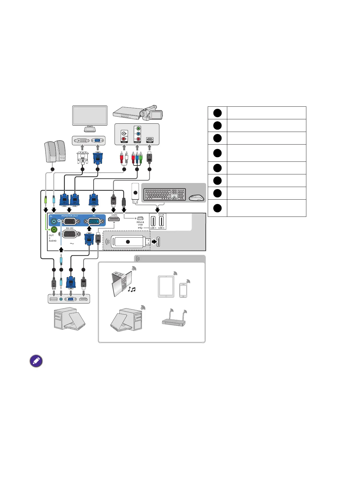 • In the connections above, some cables may not be included with the projector (see Shipping contents on page 7).