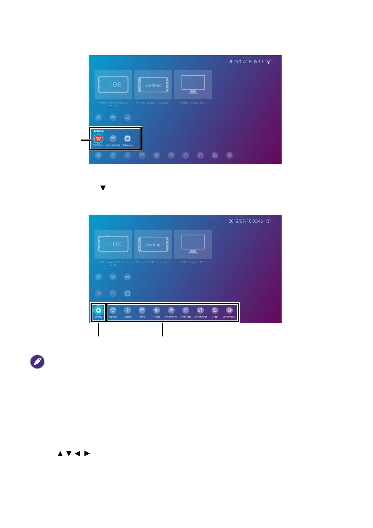Press the down button three times from the BenQ Launcher home screen to access the settings