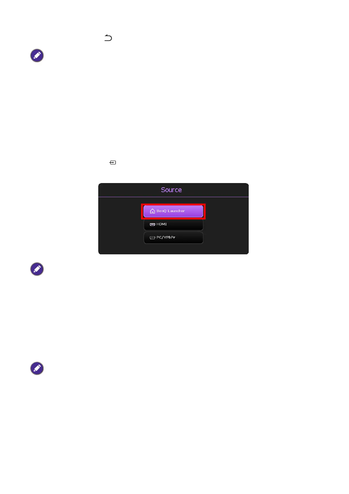 flash drive, or run apps, they must return to the BenQ Launcher interface. To return to BenQ
