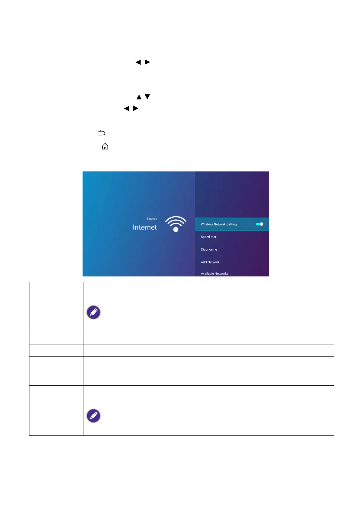 Speed Test Tests the speed of the projector’s Internet connection.