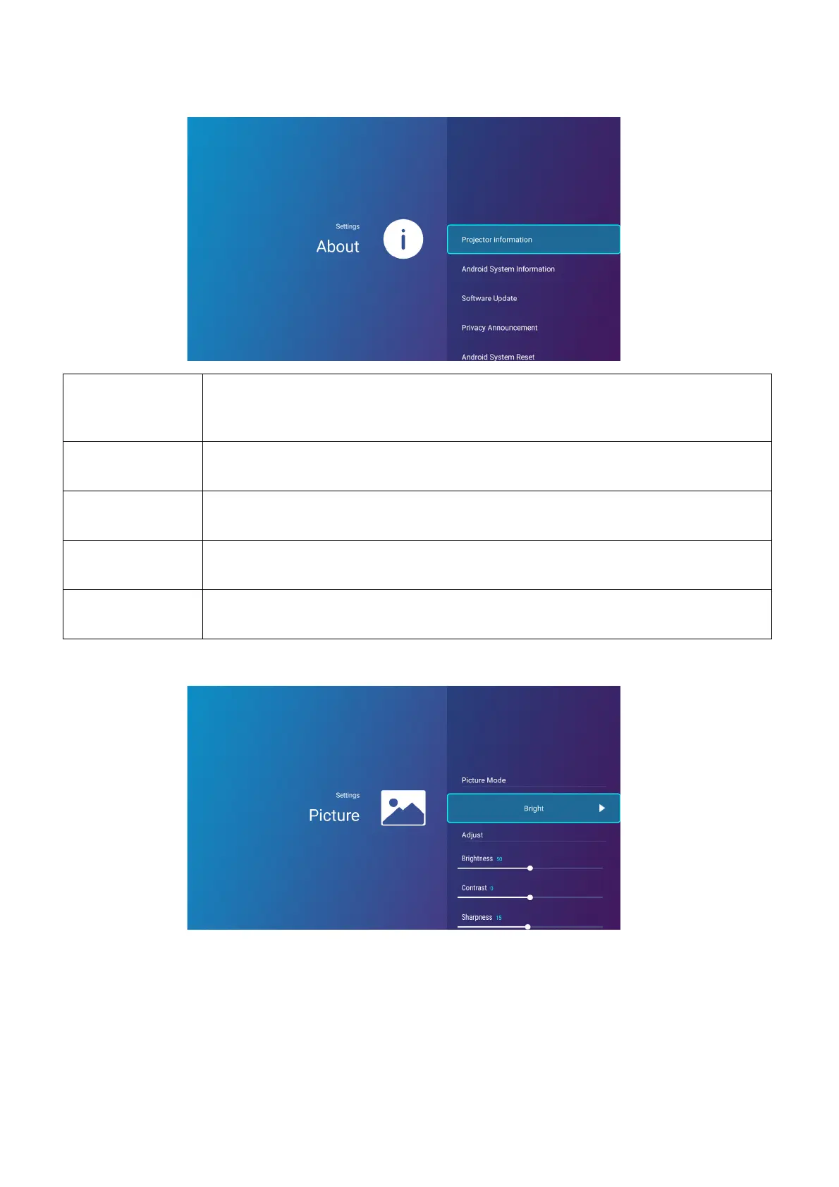 The options available for the Picture settings menu are the same as the options available in the OSD
