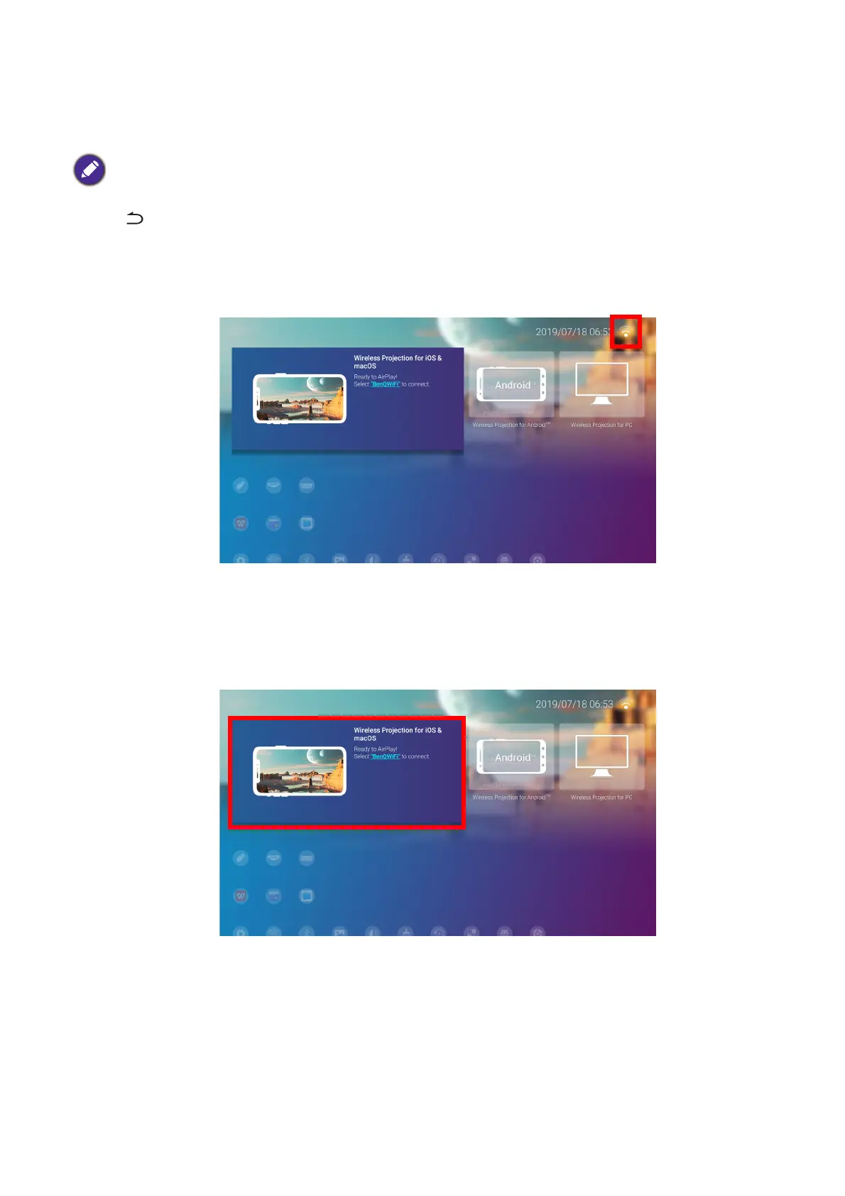 1. On the home screen of the BenQ Launcher interface, select Wireless Projection for iOS